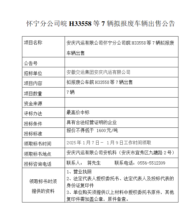 懷寧分公司皖H33558等7輛擬報(bào)廢車輛出售公告