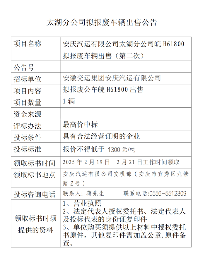 太湖分公司擬報廢車輛出售公告