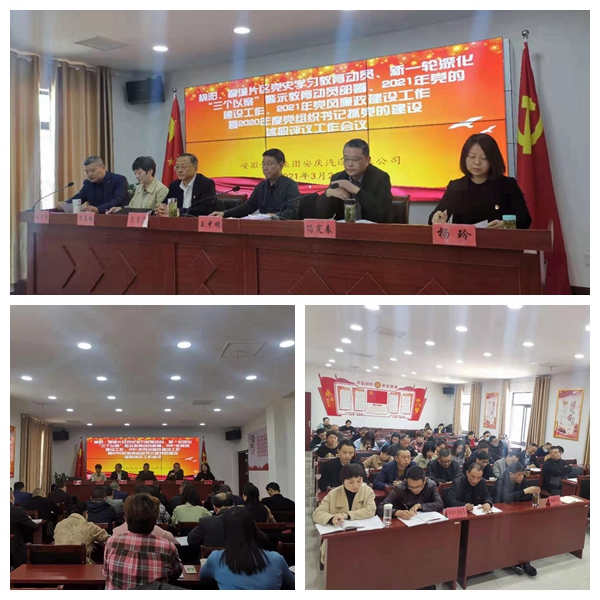 2021年3月23日下午,公司在望江分公司合并召開望江和懷寧兩片區(qū)四個單位領(lǐng)導班子成員及黨員代表參加的黨史學習教育動員、新一輪深化“三個以案”警示教育部署、2021年黨的建設(shè)工作、2021年黨風廉政建設(shè)工作暨2020年度黨組織書記抓黨的建設(shè)述職評議工作會議。公司領(lǐng)導王中明、馮定春、余雙友出席了會議。