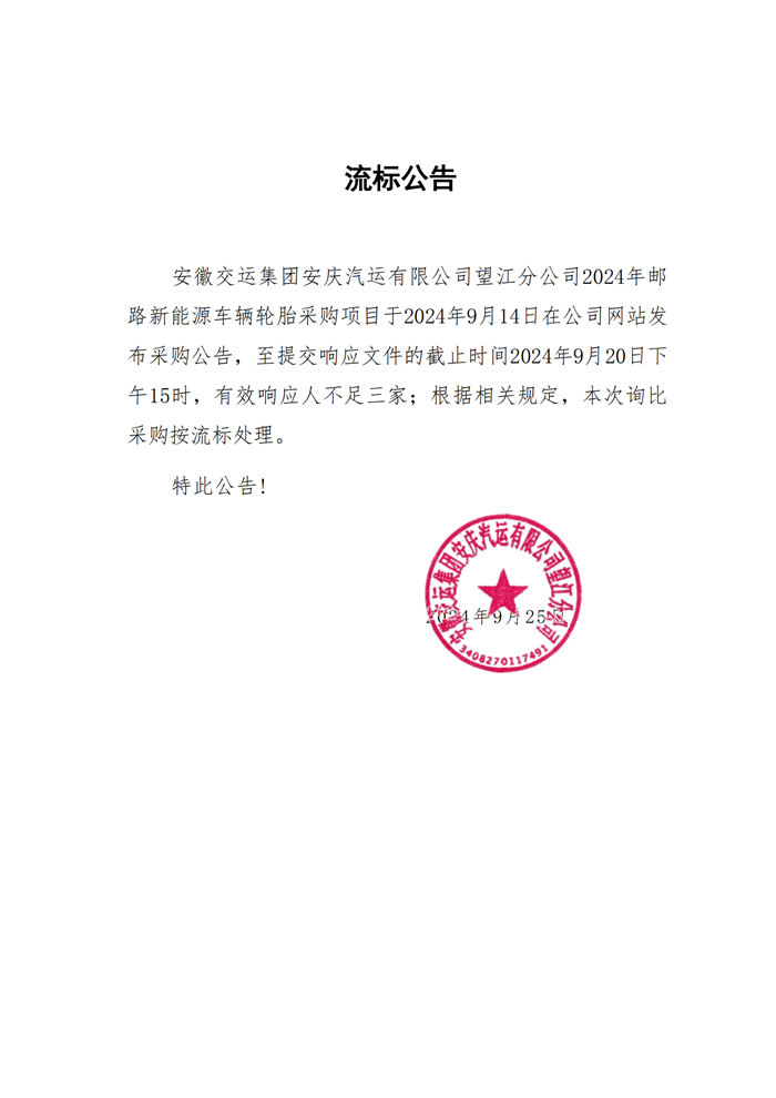 望江分公司郵路新能源車輛輪胎采購流標(biāo)公告